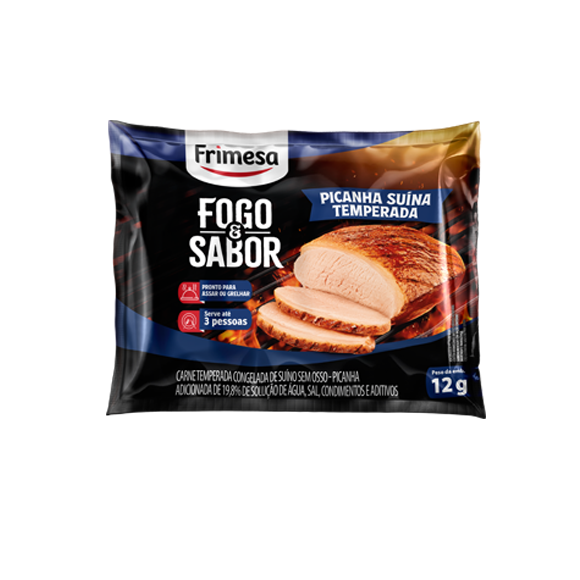 Picanha suína, água (17,7%), sal, salsa, extrato de levedura, alho, espessante carragena, estabilizante tripolifosfato de sódio, maltodextrina, antioxidante eritorbato de sódio, acidulante ácido cítrico e aromatizantes. ALÉRGICOS: PODE CONTER SOJA. NÃO CONTÉM GLÚTEN
