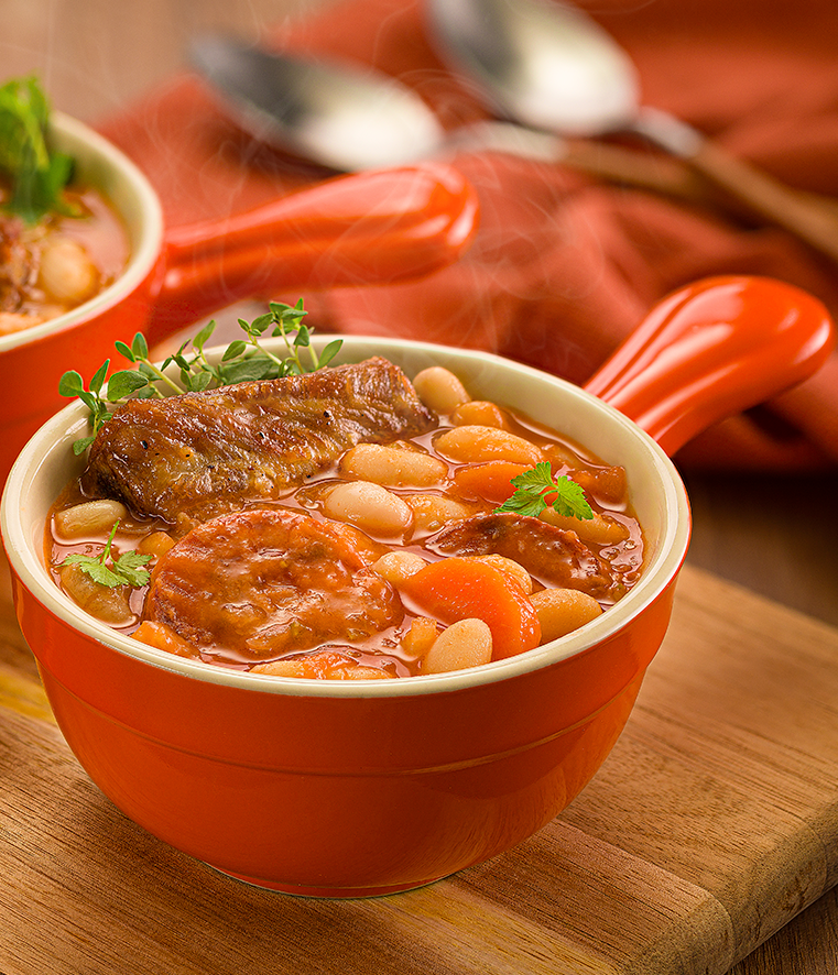 Aqueça uma panela de fundo grosso e doure a linguiça e a costelinha suína no óleo vegetal.