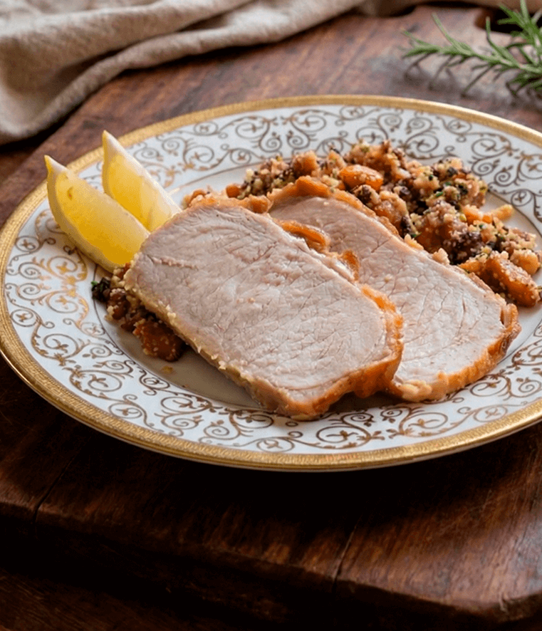 Quando a farinha estiver dourada,agregue o lombo, o bacon, a uva-passa hidratada e, por último, o abacaxi, mexendo delicadamente para que o abacaxi não solte muita água.