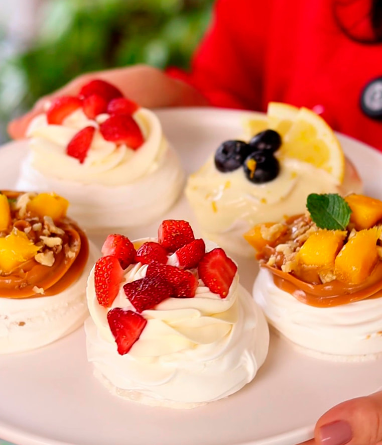 Agora, recheie cada mini pavlova e finalize com as frutas frescas. Sirva em seguida e se delicie com o sabor da Oceania.