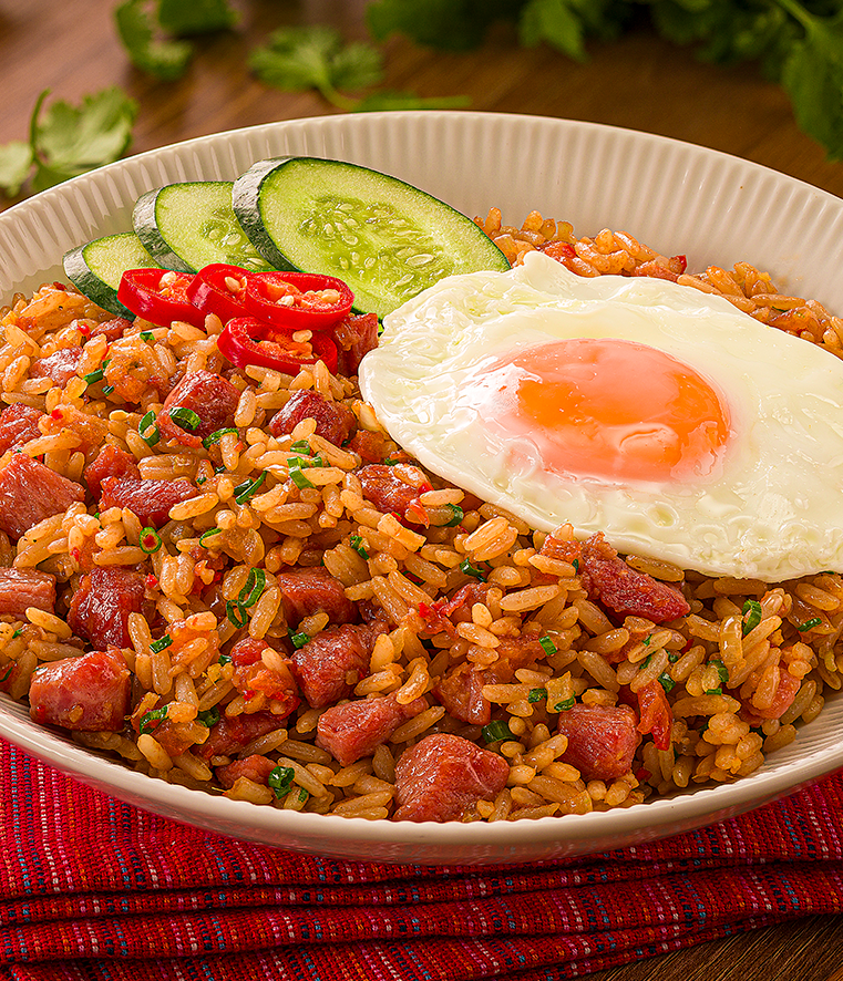 Na mesma panela, coloque o óleo restante e o óleo de gergelim e salteie a cebola e o alho. Junte a pimenta vermelha e os ovos. Mexa com uma espátula para obter ovos mexidos em pedaços pequenos. Junte o arroz cozido e mexa vigorosamente.