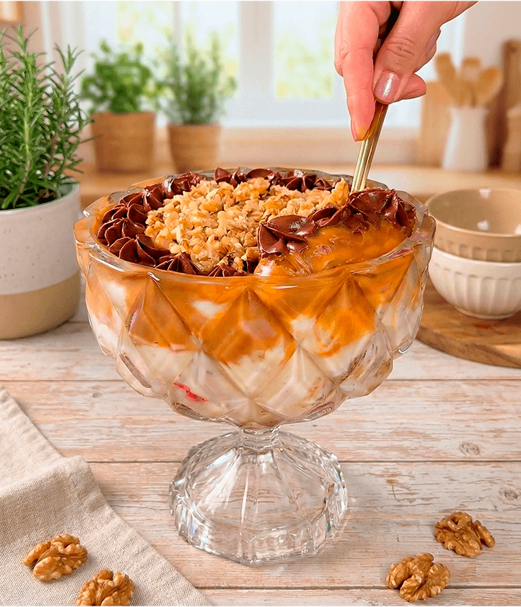 Continue intercalando as camadas até preencher o refratário. Finalize com Doce de Leite Nobre Frimesa.